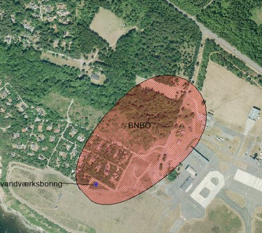 Et boringsnært beskyttelsesområde viser det område omkring en vandværksboring, hvor vandet er 1-2 år om at nå frem til boringen. Et typisk eksempel på et BNBO ses nedenfor.