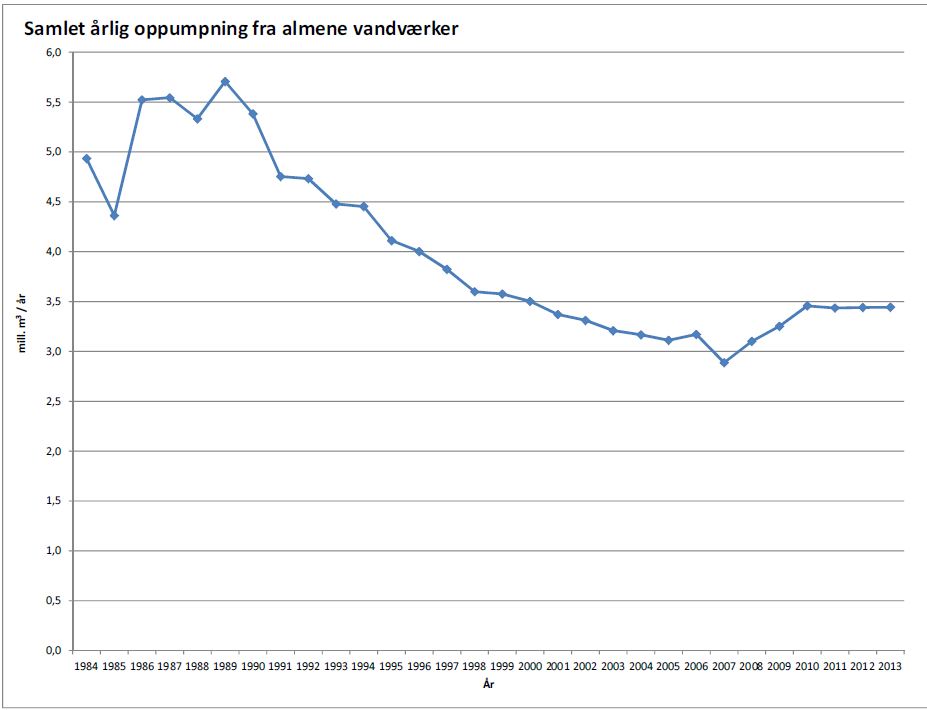 Den samlede opumpning fra vandværkerne har ligget stabilt omkring 3,5 mill. m3 gennem de seneste år. Her er næsten tale om en halvering i forhold til det store forbrug før 1990. Årligt vandforbrug kan ses nedenfor.