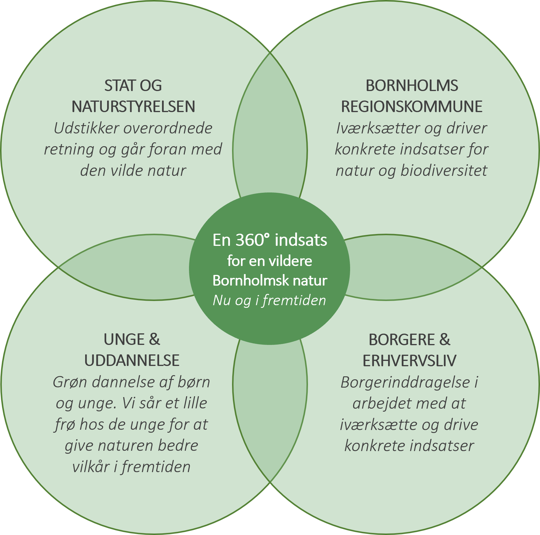 På lige fod med vores andre naturindsatser arbejder vi i Bornholms Regionskommune derfor med en omfavnende indsats for vores vilde natur. Med tiltag der inddrager alt fra stat, kommune, borgere, erhverv og unge sikrer vi, at den bornholmske natur får den opmærksomhed, plads og støtte, der er nødvendig - både i dag og i morgen (Se illustration til nedenfor).