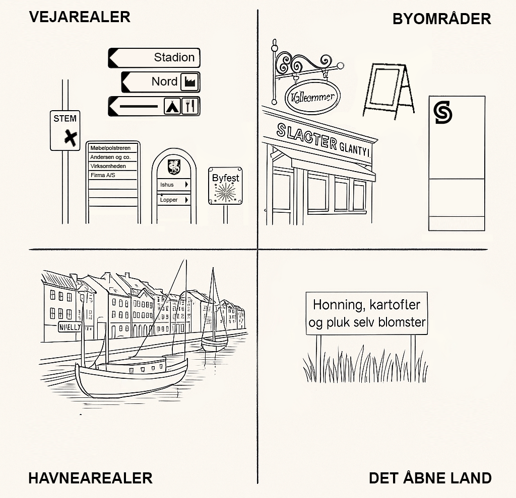 Facadeskilte, henvisningsskilte, udhængsskilte, markiser og baldakiner, lysskilte og belyste skilte, pyloner og flag, flytbar og lejlighedsvis skiltning og blændede facader.
